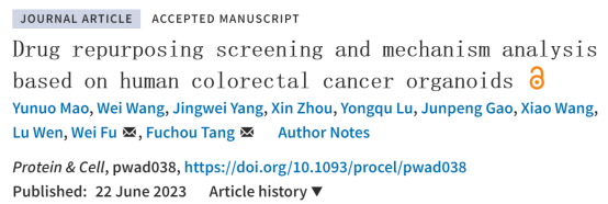 1. Mao Y, Wang W, Yang J, Zhou X, Lu Y, Gao J, Wang X, Wen L, Fu W, Tang F. Drug repurposing screening and mechanism analysis based on human colorectal cancer organoids. Protein Cell. 2023 Jun 22:pwad038.
