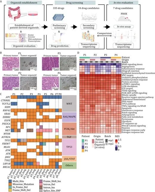 作者首先建立了長期穩定培養的、具有高度代表性的結直腸癌類器官, 觀察到患者腫瘤組織的形態各不相同,對應的類器官代表了腫瘤組織的異質性形態。為了進一步表征分子特征,在多組學水平上評估了類器官與親代腫瘤組織之間的一致性,在類器官和相應的腫瘤組織中發現了CRC中常見突變的關鍵驅動基因。這些突變根據信號通路或相關基因分為不同類型,如Wnt/β-catenin、RAS/MAPK、PI3K/AKT、TGF、TP53相關通路、JAK/STAT等。結直腸癌的關鍵驅動基因APC和TP53是結直腸癌中常見的兩種突變,在所建立的8個類器官系中均有發現,證明培養的類器官可以很好地概括體內腫瘤的遺傳特征。