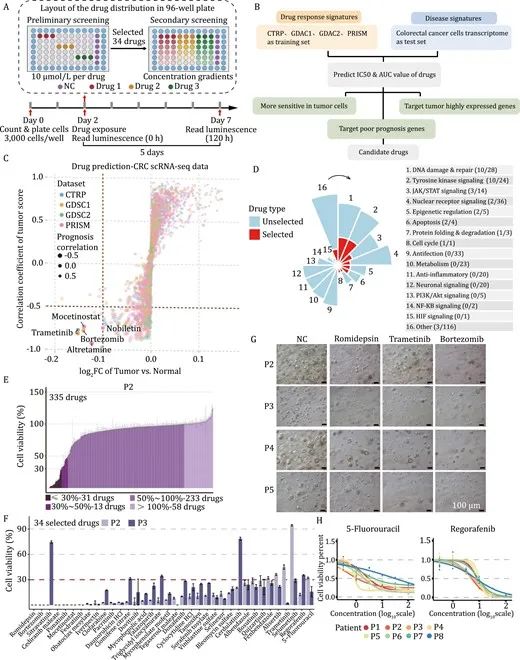 該研究基于多個數據庫建立了一套藥物預測方法,使用經過FDA批準的藥物庫,并且使用結直腸癌臨床常用藥5-氟尿嘧啶(5-Fluorouracil)和瑞戈非尼(Regorafenib)作為陽性對照,在包含預測藥物的共335種藥物中,成功篩選出34種候選藥物。為了驗證這34種候選藥物具有潛在的殺傷結腸癌類器官的能力,該研究在8個結直腸癌類器官系中進行測試,結果發現,不同患者來源的類器官對34種候選藥物的敏感性不同,臨床上常用的5-氟尿嘧啶和瑞戈非尼兩種結直腸癌治療藥物也顯示出對不同的類器官系的敏感性不同,說明不同患者之間的藥物響應差別大,從側面反映出類器官篩選藥物進而幫助指導患者用藥的重要性。