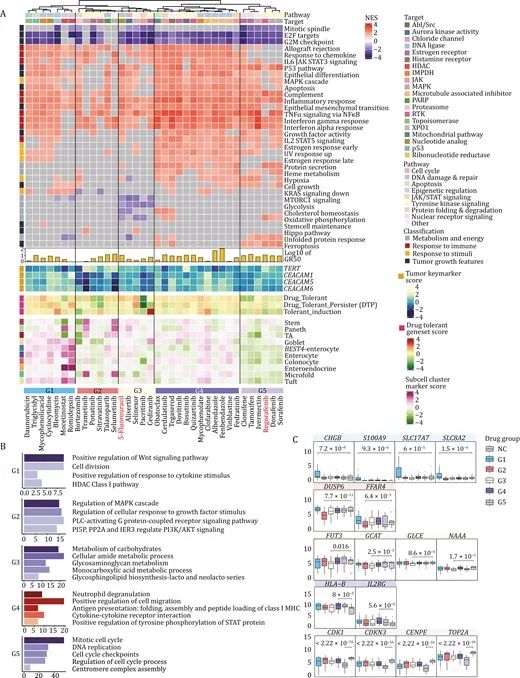 34種候選藥物都對腫瘤類器官有顯著的抑制作用,但不同的藥物干擾不同的途徑,表明它們以不同的方式抑制CRC類器官的活力。根據腫瘤相關信號的表達和基因功能富集分析確定了5種不同的藥物反應特征模式。(G1)為分化誘導組,特征是不同腸上皮細胞類型的標記基因表達較高,藥物在殺傷腫瘤細胞的同時也可能通過促進細胞分化進而抑制腫瘤細胞的增殖。(G2)為生長抑制組,特征是顯著抑制生長因子反應和MAPK信號通路的調節。(G3)為代謝抑制組,特征是其中的化合物抑制結直腸癌類器官代謝相關途徑的表達,特別是糖酵解途徑。(G4)被注釋為免疫反應促進組,特征是其中的化合物抑制腫瘤細胞增殖,而且通過增強腫瘤細胞的抗原呈遞特征,促進免疫系統攻擊腫瘤細胞。(G5)被確定為細胞周期抑制組,特征是其中的化合物顯示細胞周期和DNA復制的下降,其轉錄組特征表現為有絲分裂紡錘體功能被抑制、鐵死亡通路激活,且腸道細胞分化相關基因的表達下調。