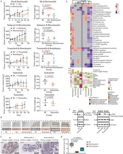 通過建立PDOX模型來評估藥物在體內環境中的治療效果。從每個藥物反應組(共7種藥物)中選擇1-2種GR50值較低且臨床使用毒性較低的藥物進行PDOX抑瘤實驗。通過計算藥物治療后小鼠的腫瘤重量,發現篩選的所有藥物都有潛在的抑瘤作用,其中,除臨床常用藥物5-氟尿嘧啶之外,曲美替尼(Trametinib)、硼替佐米(Bortezomib)和菲卓替尼(Fedratinib)的抑制腫瘤的效果明顯。根據轉錄組學數據和蛋白水平結果,進一步驗證了曲美替尼、硼替佐米和菲卓替尼可能為治療結直腸癌的潛在藥物。