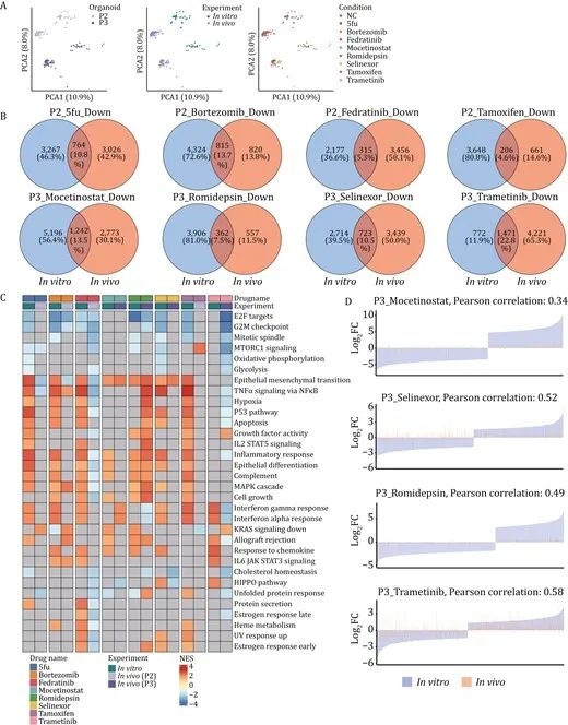 為了排除患者間異質性的影響,該研究進一步比較體外和體內系統(類器官模型和成對PDOX模型)的藥物反應差異。在兩種系統中,觀察到藥物處理細胞的轉錄組變化不一致,其中也包括臨床常用藥物5-氟尿嘧啶。同時,體外類器官和體內相應的PDOX模型之間只有大約10%的DEG重疊,并且它們之間受干擾途徑的表達不同。兩種篩選系統之間癌癥相關通路的一致性表達在不同的類器官系和不同的藥物治療中也有所不同。