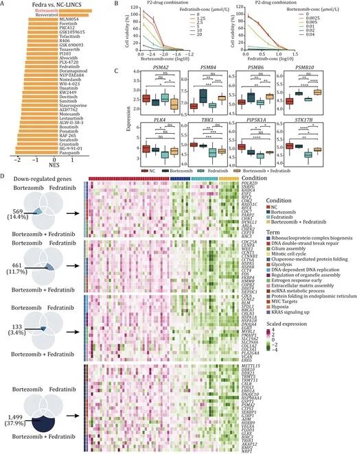 為進一步研究藥物預測方法和基于類器官的藥物篩選系統是否可以為CRC的藥物聯合治療提供有價值的線索,在具有潛在腫瘤抑制作用的三個藥物中,最初被開發用于治療骨髓纖維的菲卓替尼(Fedratinib)引起了該團隊的注意。研究發現,菲卓替尼(Fedratinib)對CRC腫瘤類器官有明顯的抑制作用。因此,研究團隊利用LINCS數據庫來預測可能與菲卓替尼(Fedratinib)有協同作用的藥物,其中,硼替佐米(Bortezomib)是排名第一的候選藥物。根據兩種患者來源的類器官系設置聯合用藥的梯度濃度,發現聯合組的抑瘤效果大于單用藥物,說明聯用菲卓替尼(Fedratinib)與硼替佐米(Bortezomib)可能具有更大的抑瘤效果,并且在PDOX模型和轉錄組測序分析中進一步驗證了協同效應。