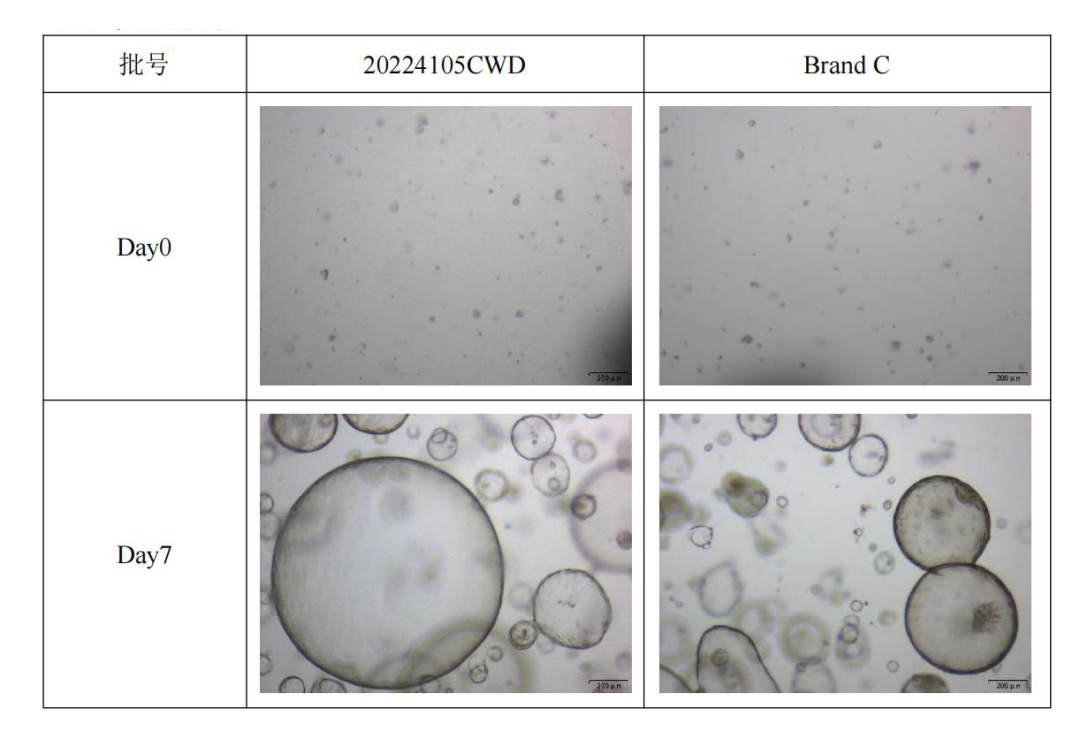 模基基質(zhì)膠與Brand C基質(zhì)膠均有良好的培養(yǎng)效果,兩組實驗膽管類器官均無明顯貼壁現(xiàn)象。其中20224105CWD的培養(yǎng)效果略勝一籌。
